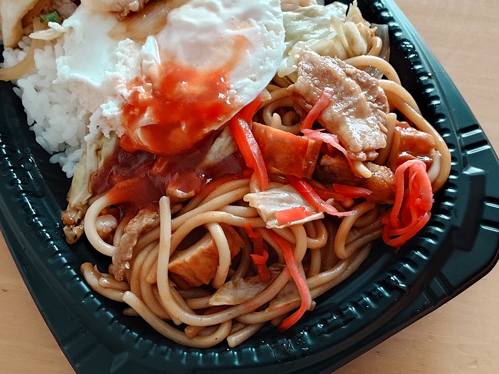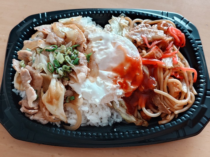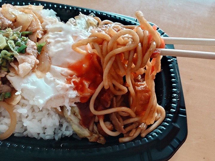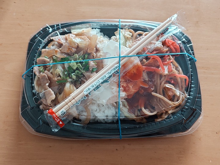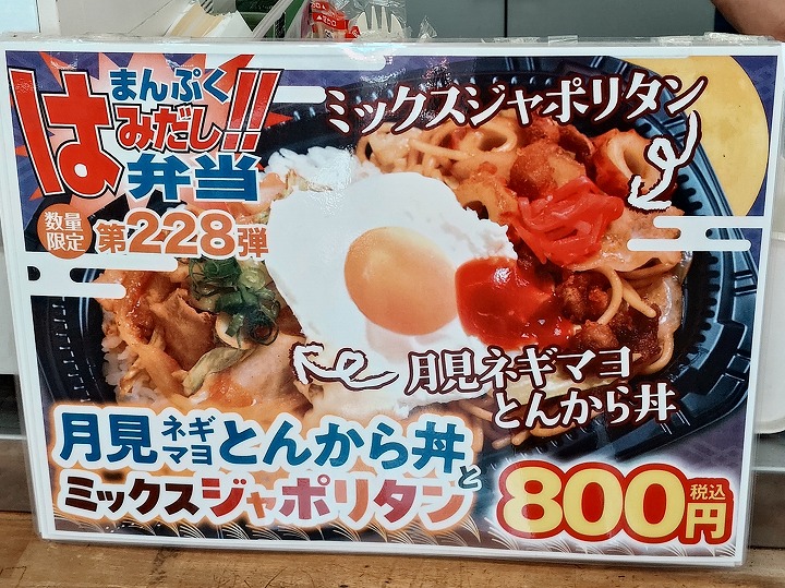 今回の「まんぷくはみだし弁当」の内容は、「月見ネギマヨとんから丼」と「ミックスジャポリタン」。
