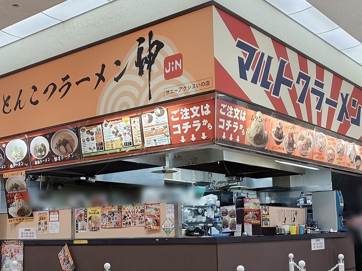 先日、選挙割を利用しに、「サニーアクシスいの店」さんのフードコートにある「とんこつラーメン神(jin)/マルトクラーメン」さんへ行ってました。